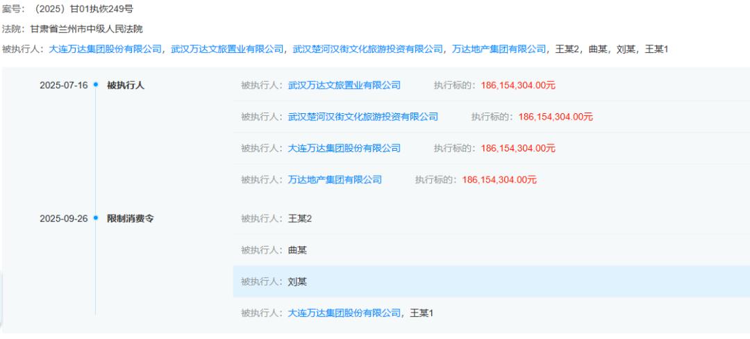 而触发此次限高令的,是一起标的金额 1.86 亿元的强制执行案件。天眼查案件审理流程显示,2025年7月16日,万达集团、武汉万达文旅置业有限公司、武汉楚河汉街文化旅游投资有限公司、万达地产集团有限公司、王某2,曲某,刘某,王某1被兰州中级人民法院列为被执行人,执行金额为1.86亿元。