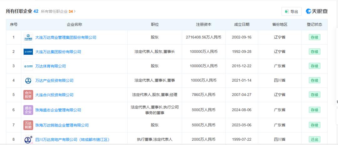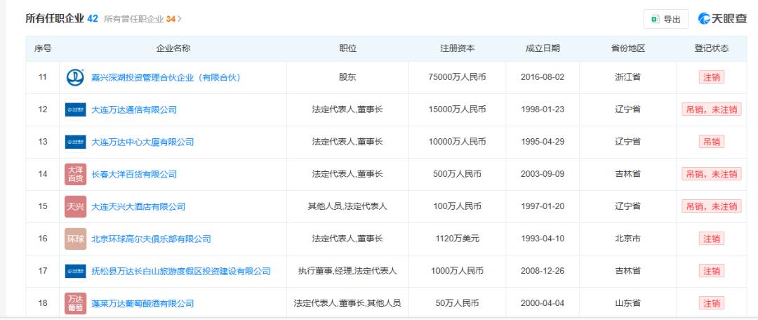天眼查显示,截至目前,王健林任职的42家公司中,仅剩剩10 家处于存续状态,其余均已吊销或注销。