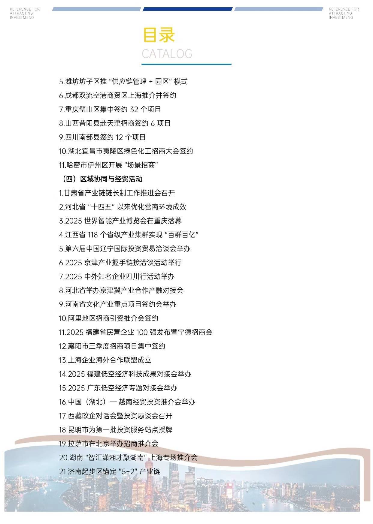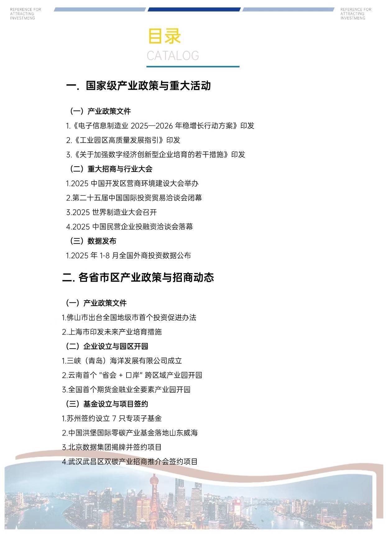 打开首刊,“宏观-中观-微观”三维内容架构亮点纷呈,每一篇都满载9月份最新招商干货。宏观板块“国家级产业政策与重大活动”专栏,解读了《电子信息制造业2025-2026年稳增长行动方案》《工业园区高质量发展指引》等3项重磅政策,更同步梳理2025中国开发区营商环境建设大会、第二十五届中国国际投资贸易洽谈会等4场高规格活动成果,仅投洽会就签约1154个项目、总投资达6440亿元,这些关键数据为招商方向精准把脉;中观板块“各省市区产业动态”一口气收录21个地方最新创新案例,从佛山实施全国首个地级市投资促进办法,到云南首个“省会+口岸”跨区域产业园开园,再到苏州设立65亿元专项子基金、重庆璧山区32个项目集中签约145.3亿元,各地招商妙招一目了然;微观板块直面地方招商发展,罗列潍坊坊子区“供应链管理+园区”模式、哈密伊州区“场景招商”等实战经验,让招商人拿来就能用。