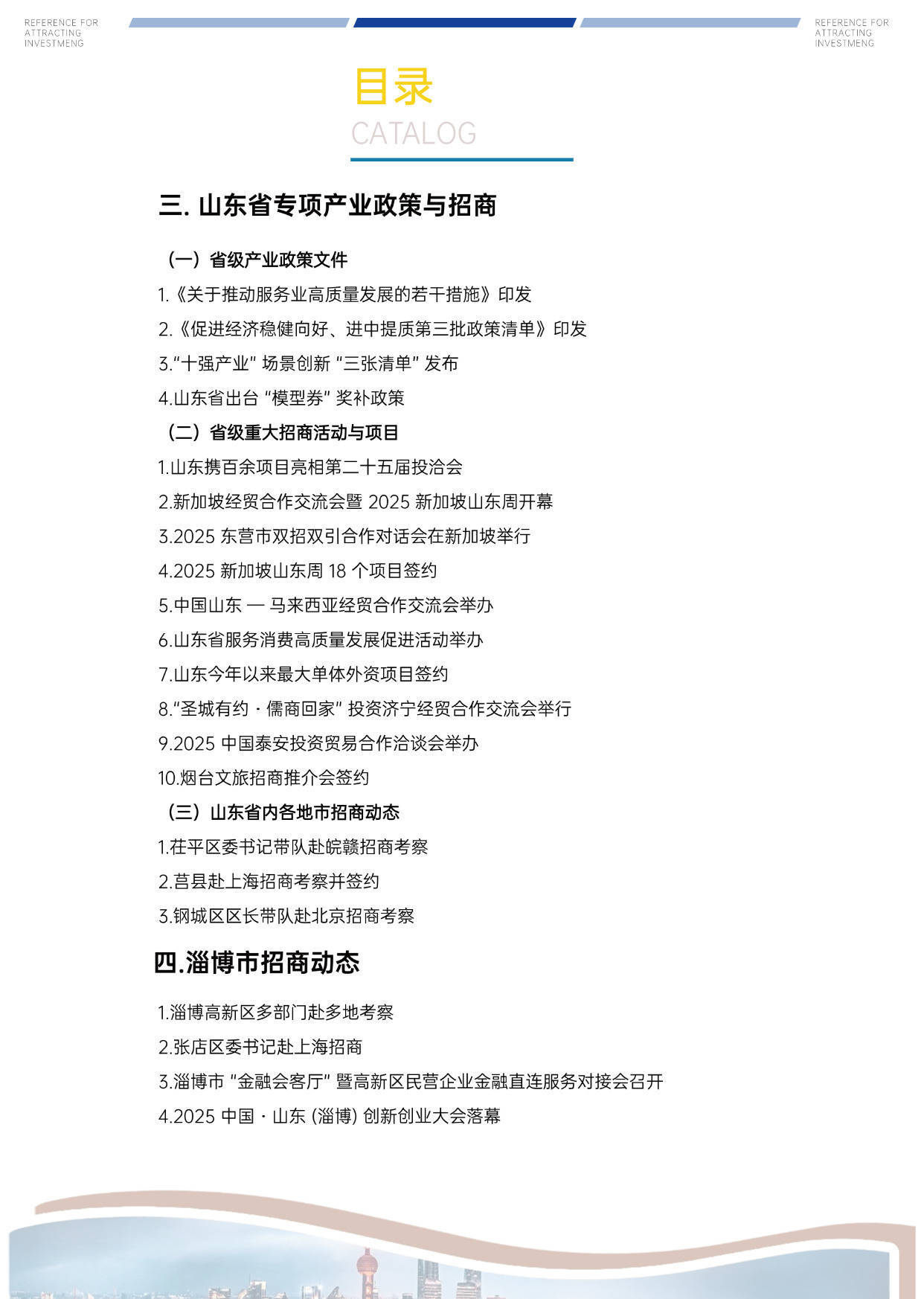 月刊聚焦山东及淄博招商,更是量身定制的宝库。“山东省专项产业政策与招商”板块,既解读《推动服务业高质量发展的若干措施》《“模型券”奖补政策》等省级利好政策,也记录山东的招商成绩单:携百余项目亮相投洽会、新加坡山东周18个项目签约8.2亿美元、山东省今年最大单体外资项目(万华科威特6.38亿美元石化项目)落地……每一项成果都振奋人心;在淄博专属板块梳理了区域招商动作:高新区组队赴北京、上海、杭州考察天和智航、正泰电器项目;张店区委书记带队赴沪对接盒马鲜生,还有“金融会客厅”破解民企融资难题、创新创业大会签约8个人才项目等,为同类城市提供可复制的淄博经验。