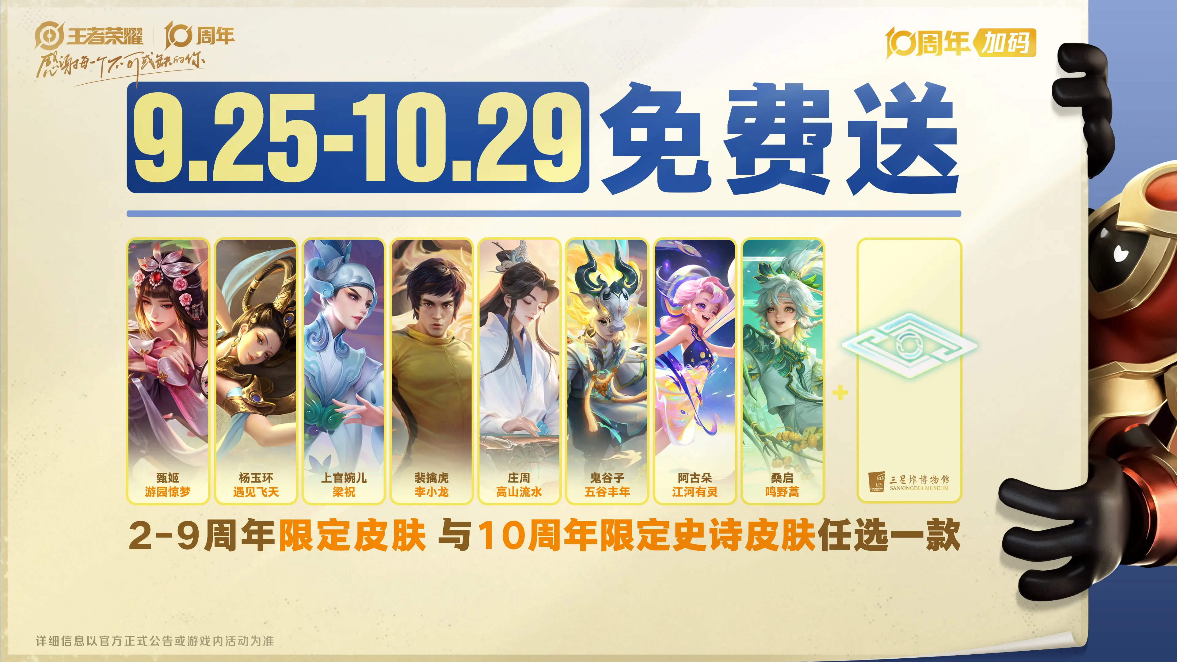 十周年限定皮肤一共有四款,第一款是需要300活动积分兑换的全新史诗皮肤(10.15);第二款是需要1000限时点券兑换的全新传说皮肤(10.25);第三款是10月25日上架的全新史诗皮肤,可能只需要60点券;第四款是10月25日上架的全新直售传说皮肤。